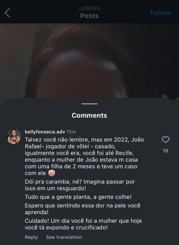 Identificada como Kelly Fonseca, uma mulher alegou que a jogadora foi pivô da separação do jogador de vôlei João Rafael, em 2022. “Talvez você não lembre, mas em 2022, João Ratael- Jogador de vôlei – casado, igualmente você era, você foi até Recife, enquanto a mulher de João estava em casa com uma filha de 2 meses e teve um caso com ele”, escreveu a moça.