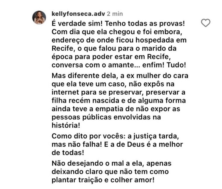A advogada ainda afirmou que tem provas do ocorrido e mandou um recado para Nathalia. “É verdade sim! Tenho todas as provas! Com dia que ela chegou e foi embora, endereço de onde ficou hospedada em Recife, o que falou para o marido da época para poder estar em Recife, conversa com o amante… enfim! Tudo!”, disparou.