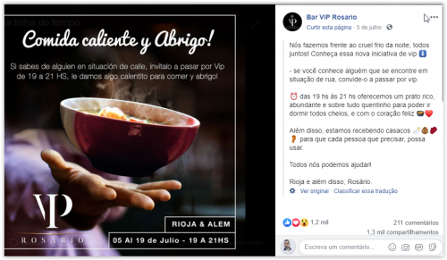 Conforme a publicação, feita na sexta-feira (5), o restaurante irá oferecer alimento para as pessoas que forem até o local entre 19h e 21h. Já as roupas de frio serão doadas as pessoas que pedirem. É inverno na Argentina, e a temperatura de Rosário, de acordo com o Climatempo, na madrugada desta terça-feira foi de 4°c.
