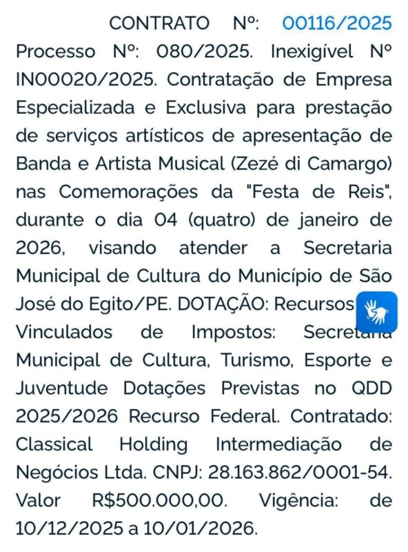 Conforme a colunista, um dos contratos prevê o pagamento de cerca de R$ 500 mil para uma apresentação da dupla no interior do estado de Pernambuco, com recursos provenientes do Governo Federal.