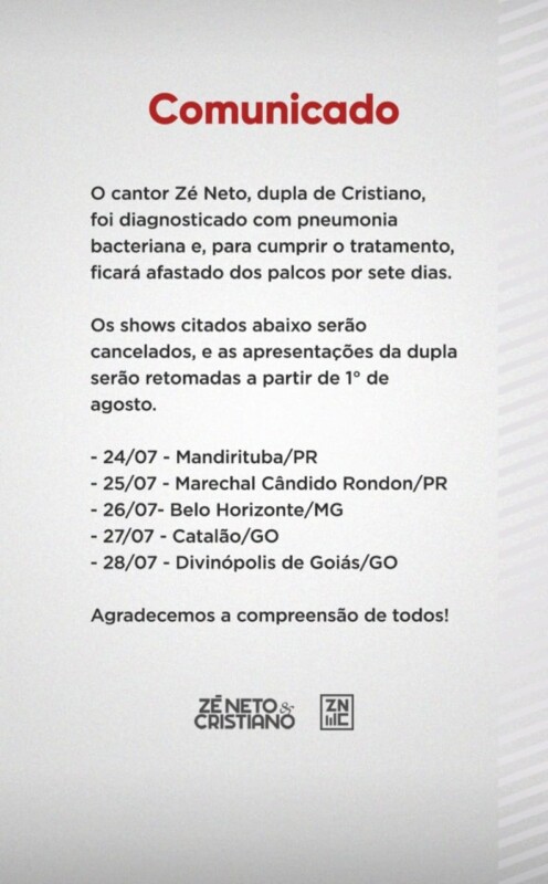 O cantor Zé Neto, da dupla com Cristiano, ficará afastado dos palcos para tratar uma pneumonia bacteriana. De acordo com informações da assessoria do artista, divulgadas nesta terça-feira (22), alguns shows da dupla serão cancelados.