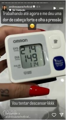 “Trabalhando até agora [02:20] e me deu uma dor de cabeça forte. Olha a pressão: 21/14. Vou tentar descansar kkkkk. Adivinha? Estou trabalhando ainda. Quer ter sucesso? Trabalhe enquanto as pessoas dormem”, disse ela.