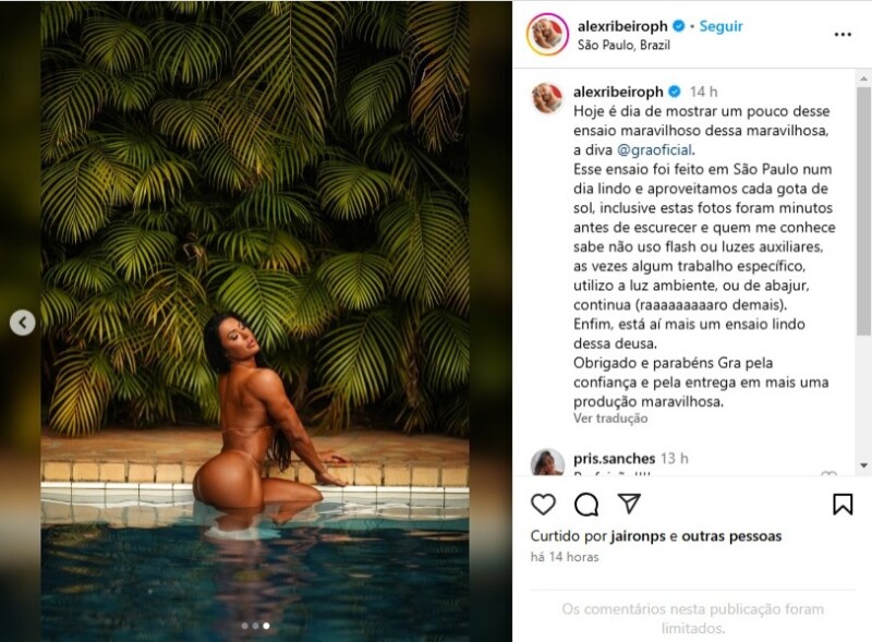“Hoje é dia de mostrar um pouco desse ensaio maravilhoso dessa maravilhosa, a diva Gracyanne Barbosa. Esse ensaio foi feito em São Paulo num dia lindo e aproveitamos cada gota de sol, inclusive estas fotos foram minutos antes de escurecer”, escreveu o profissional na legenda da publicação.