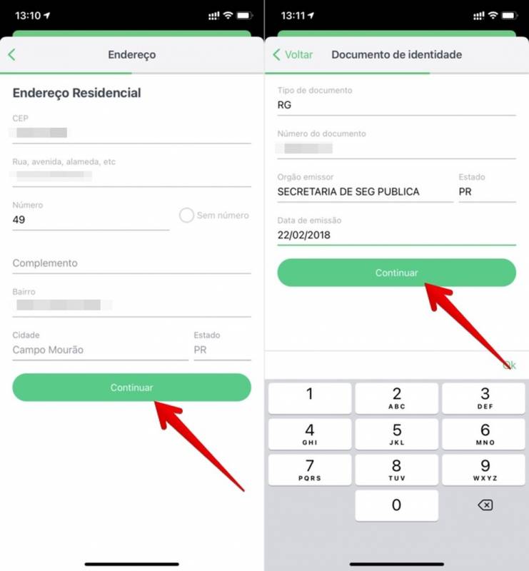Passo 2. Informe o seu endereço completo e toque em “Continuar”. Na próxima etapa, escolha o tipo de documento de identificação e forneça os dados. Feito isso, toque novamente em “Continuar”;