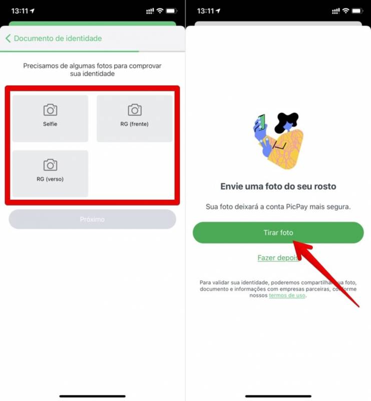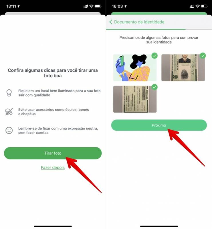 Passo 4. O PicPay mostrará dicas sobre como tirar fotos com boa qualidade. Toque em “Tirar foto” para enviar dados do seu documento e uma selfie. Após enviar todas as imagens necessárias, pressione “Próximo”;