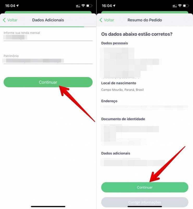 Passo 5. Informe a sua renda mensal e patrimônio. Na próxima tela, confira se as informações fornecidas estão corretas e toque em “Continuar” para pedir o seu PicPay Card de débito ou crédito;