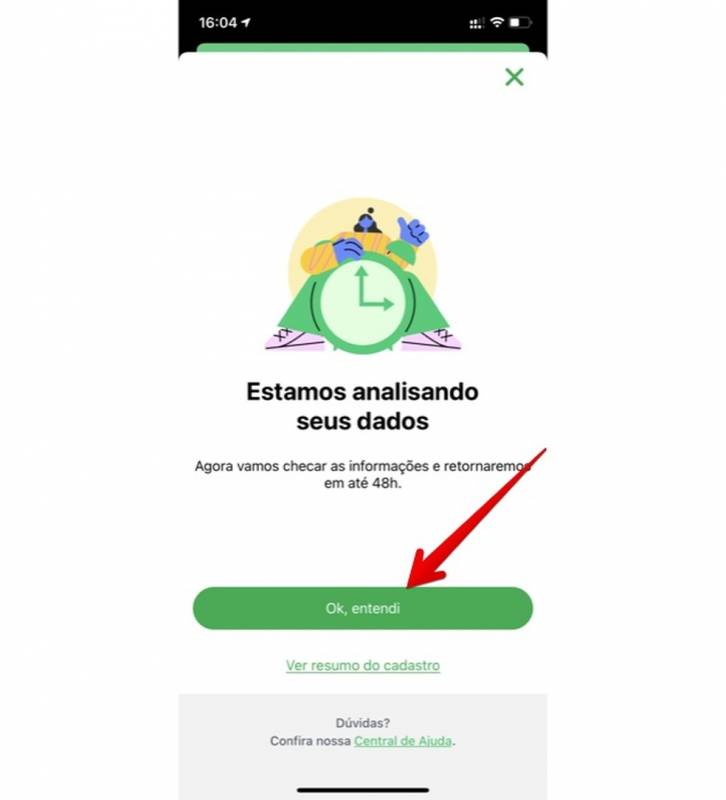 Passo 6. O pedido de cartão do PicPay será enviado para análise, que deve acontecer em até 48 horas. Por fim, toque em “OK, entendi” para finalizar. Se aprovado, o cartão será enviado para o seu endereço.