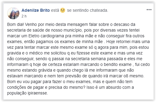 “Bom dia! Venho por meio desta mensagem falar sobre o descaso da secretaria de saúde de nosso município, pois por diversas vezes tentei marcar um Eletro cardiograma pra minha mãe e não conseguir fira outros exames, então pagamos os exames de minha mãe . Hoje retornei mais uma vez para tentar marcar este mesmo exame só q agora para mim, pois estou gravida e o médico me solicitou q eu fizesse este exame e mas uma vez não conseguir, sendo q passai na secretaria semana passada e eles me informaram q hoje de certeza estariam marcando o bendito exame , fui cedo mesmo estando grávida e quando chego lá me informaram que não estavam marcando e nem tem previsão de quando irá marcar o8 mesmo. Bom eu vou pagar para fazer o meu exames, mas e quem não tem condições de pagar e precisa do mesmo? Isso é um absurdo com a população ipiraensse.” relata Adenilze.