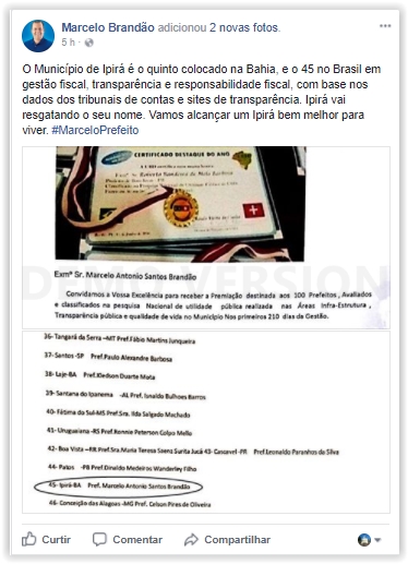 No dia 20/09/2017, o prefeito de Ipirá, Marcelo Brandão, divulgou em sua rede social o resultado de uma pesquisa realizada pela mesma UBD que aponta Ipirá como o 5º melhor município do estado da Bahia nos quesitos: melhor gestão, transparência e responsabilidade fiscal. Já em esfera nacional, essa mesma pesquisa diz que Ipirá ocupa a 41ª  posição entre todos outros municípios brasileiros pesquisados pela empresa. Veja abaixo: