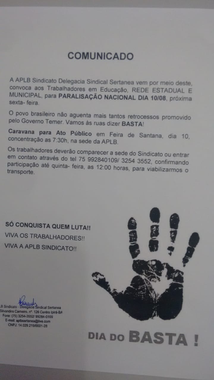 A APLB Sindicato Delegacia Sindical Sertanea convoca os trabalhadores em educação da rede estadual e municipal de ensino para aderirem à paralisação nacional que está prevista para acontecer na próxima sexta-feira (10/08).
