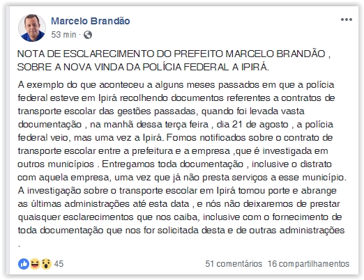 No final da manhã desta terça-feira (21), o prefeito de Ipirá, Marcelo Brandão (DEM), publicou em sua rede social uma nota de esclarecimento sobre os mandados compridos pela Polícia Federal em Ipirá, ocorrido na manhã de desta terça-feira (21) (veja aqui).