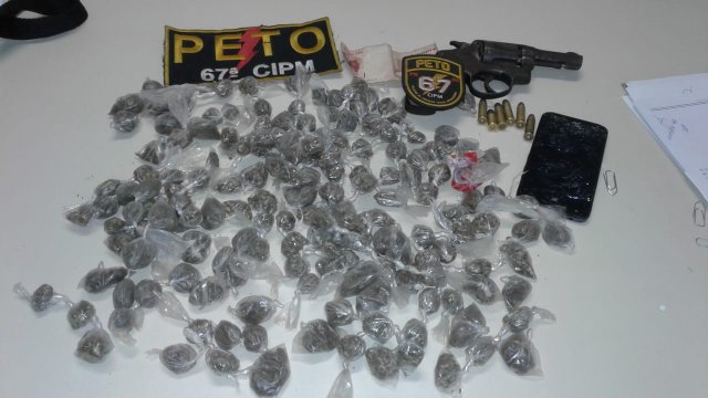 Segundo o soldado Jair Moraes, comandante da guarnição Peto 67ª, com o suspeito foram encontradas 174 buchas de maconha, um revólver sem marcacal .38, um aparelho celular e munições.