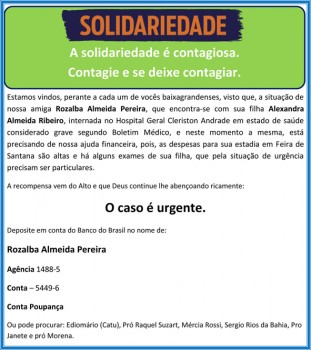 Internada há duas semanas no Hospital Clériston Andrade em Feira de Santana, o estado de saúde da jovem Alexandra Almeida Ribeiro, filha de Rozalba Almeida Pereira, vem motivando várias pessoas a campanha em prol de sua recuperação, muitos estão em campanha de oração/reza, outros a todo instante envia mensagem de apoio aos familiares, e neste sábado um grupo de amigos se reuniram e lançaram uma campanha de doações para arcar com despesas de exames, medicamentos, deslocamentos, passagens e hospedagens de acompanhantes.
