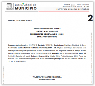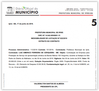 Os documentos foram publicados no Diário Oficial do Município, no dia 19/07. A empresa responsável pela contração da banda foi a LUIZ AMÉRICO FERREIRA DE CERQUEIRA – ME.