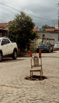 Cadeira é usada para sinalizar buraco em rua de Ipirá