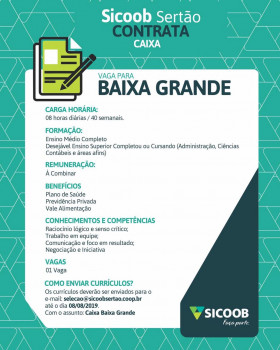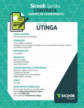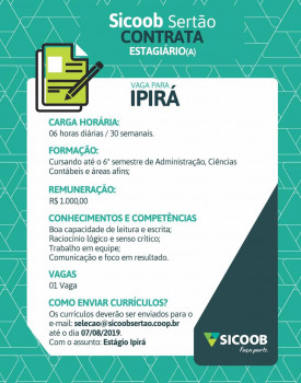 Sicoob Sertão está ofertando 03 vagas de estágio são para as cidades de Ipirá, Baixa grande e Utinga. Os currículos deverão ser enviados para [email protected] e não esqueça de especificar pra qual cidade deseja ser selecionado (a). Veja os detalhes abaixo: