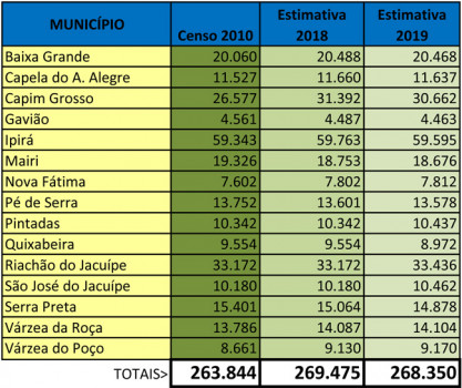 Dados do Instituto Brasileiro de Geografia e Estatística – IBGE, indicam que o território de identidade Bacia do Jacuípe terá sua população reduzida ao final deste ano de 2019.