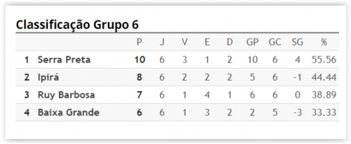 Com a vitória, a Seleção de Ipirá se classificou em 2º lugar do grupo e na próxima fase enfrentará a Seleção de Valente. Já a equipe de Baixa Grande, com apenas 6 pontos ganhos foi eliminada da competição.