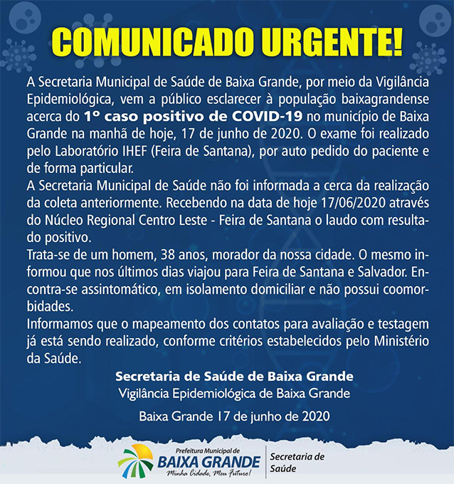 A Secretaria Municipal de Saúde de Baixa Grande confirmou na tarde desta quarta-feira (17) o primeiro caso de infecção pelo novo coronavírus no muncípio. O paciente é um homem de 38 anos, morador do munícipio.