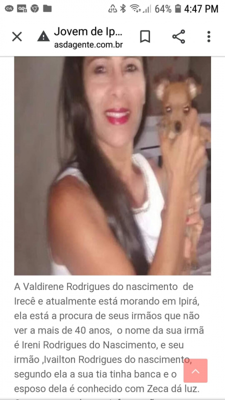 Irene Rodrigues do Nascimento, de 57 anos, moradora da cidade de São Gabriel, centro do norte da Bahia, está à procura de sua irmã Valdirene Rodrigues do Nascimento, que não vê há 40 anos e que estaria em Ipirá.