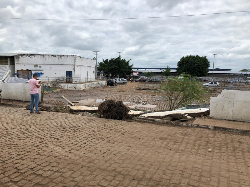 feira livre, foi necessária a realização de um mutirão solidário nesta segunda-feira, que contou com ajuda de populares e de uma empresa privada que cedeu caminhões pipa de água para lavar a sujeira principalmente no mercado de farinha, um dos locais mais atingidos pela enxurrada.