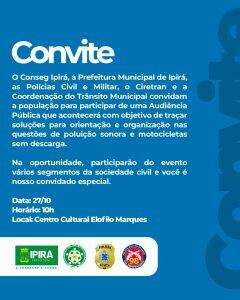O Conselho Comunitário de Segurança- Conseg/Ipirá, a Prefeitura Municipal, as policias Civil, Militar, a 21ª Ciretran, a Coordenação Municipal de Trânsito e os demais Conselhos Comunitários do Município, convidam a população para participar da Audiência Pública que abordará a problemática da Poluição Sonora no município.
