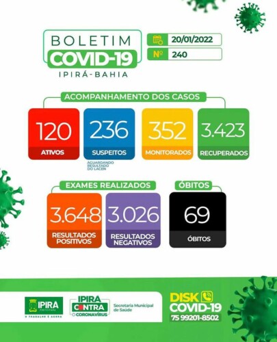 A Secretaria de Saúde de Ipirá registrou, nesta quinta-feira (20), mais uma morte por Covid-19. Com isso, o município chega a um total 69 óbitos causados pelo coronavírus desde o início da pandemia. A prefeitura não deu detalhes sobre esta última morte.