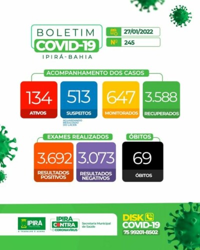 Nas últimas 24 horas foram confirmados mais 32 casos de Covid-19 em Ipirá. A informação é do boletim da Secretaria Municipal de Saúde, divulgado nesta quinta-feira (27).
