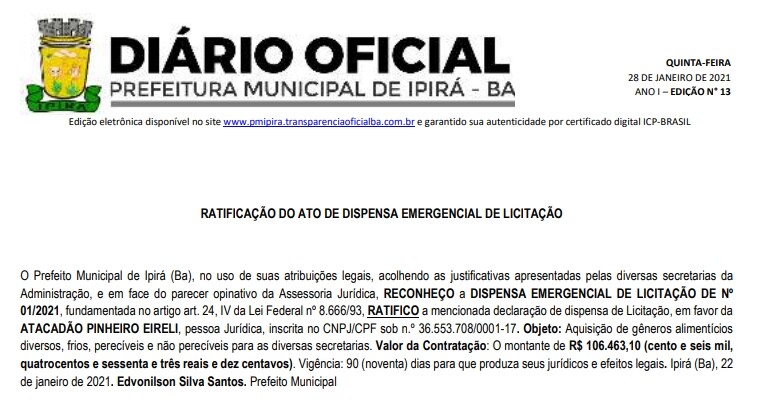 A prefeitura de Ipirá realizou gastos no valor de R$ 106.463,10 (cento e seis mil,quatrocentos e sessenta e três reais e dez centavos) para fechar um contratos emergencial, sem licitação, para compra de alimentos.