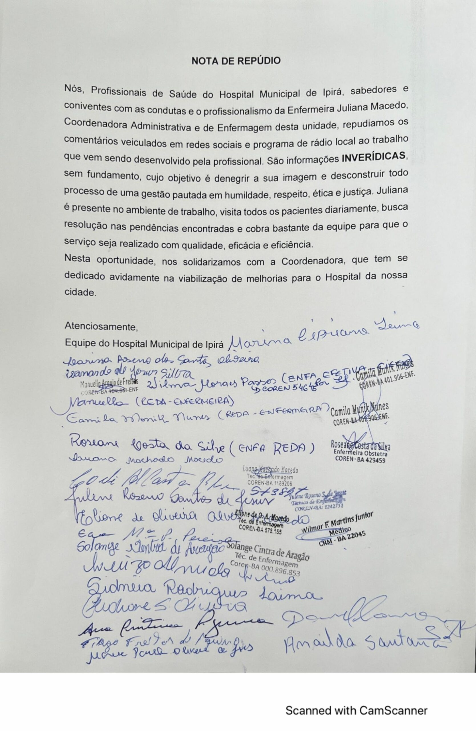 Funcionários divulgaram uma nota em defesa da coordenadora do Hospital Municipal de Ipirá, a enfermeira Juliana Macedo, na tarde desta quarta-feira (24), após denúncias de que a mesma estaria perseguindo e desrespeitando colegas de trabalho (veja aqui).