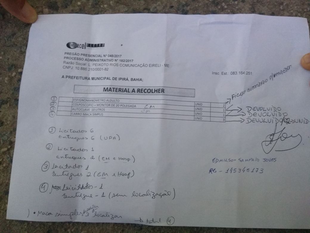 Entretanto, essa informação do vereador está um pouco divergente com a imagem (abaixo) de um rascunho enviado para nossa redação. Na imagem é possível perceber que o rascunho parece se tratar de aparelhos que foram entregues de maneira excedente nas unidades hospitalares, e então os funcionários da empresa que está localizada em Capela do Alto Alegre, retornou ao município para recolher o excedente.