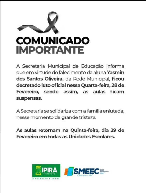 Em nota, a prefeitura de Ipirá lamentou a morte de Yasmin e decretou luto oficial nesta quarta-feira (28).