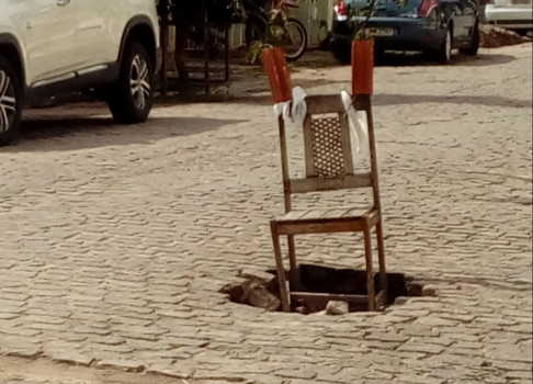 Cadeira é usada para sinalizar buraco em rua de Ipirá