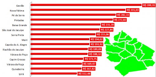 Em 2017 o município de Gavião investiu R$ 399,31 por habitante. Por outro lado, o município de Ipirá com 62.631 habitantes investiu R$ 152,48 por habitantes, apresentando um aumento de R$ 20,89 em comparação ao ano anterior que foi apenas R$ 131,59.
