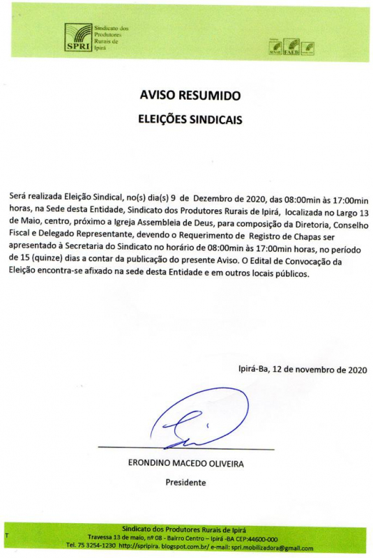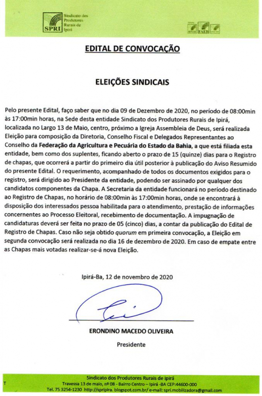 Pelo presente Edital, faço saber que no dia 09 de Dezembro de 2020, no período de 08:00min às 17:00min horas, o Sede desta entidade Sindicato dos Produtores Rurais de ‘pirá, localizada no Largo 13 de Moo, centro, próximo a Igreja Assembleia de Deus, será realizada Eleição para composição da Diretoria, Conselho Fiscal e Delegados Representantes ao Conselho da Federação da Agricultura e Pecuária do Estado da Bahia, a que está filiada esta entidade, bem como dos suplentes, ficando aberto o prazo de 15 (quinze) dias para o Registro de chapas, que ocorrerá a partir do primeiro dia útil posterior á publicação do Aviso Resumido do presente Edital. O requerimento, acompanhado de todos os documentos exigidos para o registro, será dirigido ao Presidente da entidade, podendo ser assinado por qualquer dos candidatos cornponentes da Chapa. A Secretaria da entidade funcionará no período destinado ao Registro de Chapas, no horário de 08:00rnin às 17:00min horas, onde se encontrará à disposição dos interessados pessoa habilitada para o atendimento, prestação de informações concernentes ao Processo Eleitoral, recebimento de documentação. A impugnação de candidaturas deverá ser feita o prazo de 05 (cinco) dias, a contar da publicação do Edital de Registro de Chapas. Caso não seja obtido quorum em primeira convocação, a Eleição em segunda convocação será realizada no dia 16 de dezembro de 2020. Em caso de empate entre as Chapas mais votadas realizar-se-á nova Eleição.