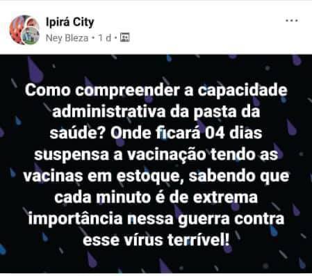 “Como entender a capacidade administrativa da pasta da saúde? Onde ficará 04 dias suspensa a vacinação tendo as vacinas em estoque, sabendo que cada minuto é de extrema importância nessa guerra contra esse vírus terrível!“, questiona um internauta.