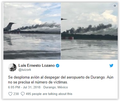 O jornalista Luis Ernesto Lozano, do Canal 10 Durango, postou em seu perfil no Twitter fotos que mostram fumaça que seria do avião acidentado.