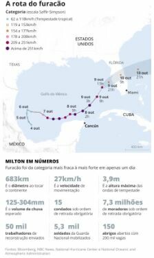 O Milton tocou o solo da Flórida na noite de quarta-feira, classificado como um furacão de categoria 3 — com ventos de 193 km/h — mas já provocava fortes chuvas e uma onda de tornados antes de chegar ao continente. O furacão foi rebaixado para a categoria 1, com ventos de 138 km/h, no começo da manhã desta quinta.
