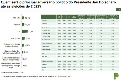 Segundo a pesquisa, o petista figura com 32%; seguido por Ciro Gomes (PDT), com 15,5%; pelo governador de São Paulo João Dória (PSDB), com 11,7% e o apresentador Luciano Huck, com 8,3%. Um dos principais rivais de Bolsonaro atualmente, o governador do Rio de Janeiro, Wilson Witzel (PSC), aparece com 3%, enquanto o presidente da Câmara dos Deputados, Rodrigo Maia (DEM), figura com 1,9%.