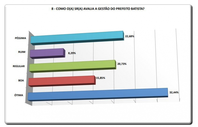 O levantamento também questionou a avaliação dos moradores de Pintadas da gestão do prefeito Batista da Farmácia (DEM). Ficou desta forma: ótima (32,44%), péssima (22,68%), regular (20,73%), boa (15,85%) e ruim (8,29%).