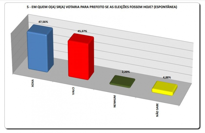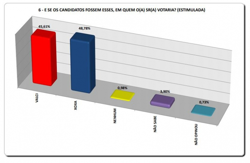 Já no cenário estimulado, Xoxa figura com 48,78% e Valcyr com 45,61%; 0,98% não votariam em nenhum, 3,90% não sabem e 0,73% não opinaram.