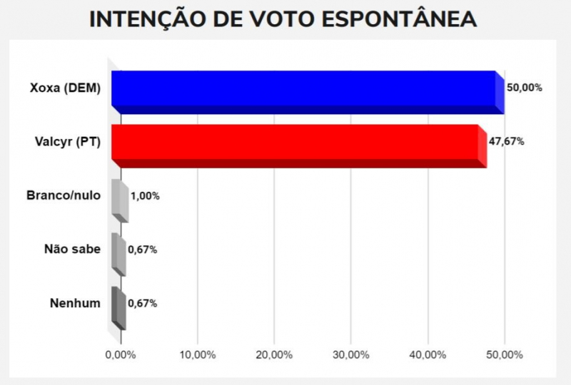 Na pesquisa espontânea, em que os eleitores responderam em quem votariam para prefeito sem que fossem apontadas alternativas, Xoxa tem 50% das intenções de voto e Valcyr 47,67%. Os demais eleitores afirmaram votar nulo ou branco (1%), não souberam (0,67%) e não votariam em nenhum (0,67%).