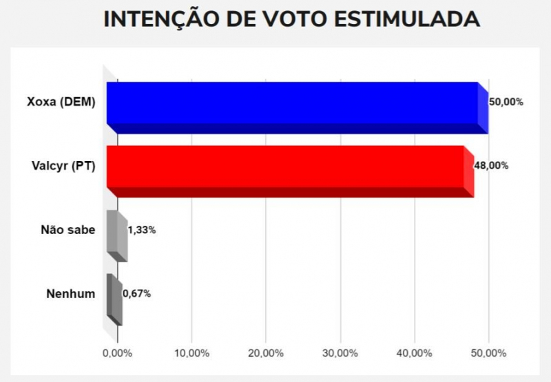 No cenário estimulado, em que os eleitores apontam em quem votariam a partir de opções apresentadas pelo pesquisadores, Xoxa segue na frente com 50%, Valcyr segue de perto com 48%. Aqueles que não souberam são 1,33% e não escolheram nenhum 0,67%.