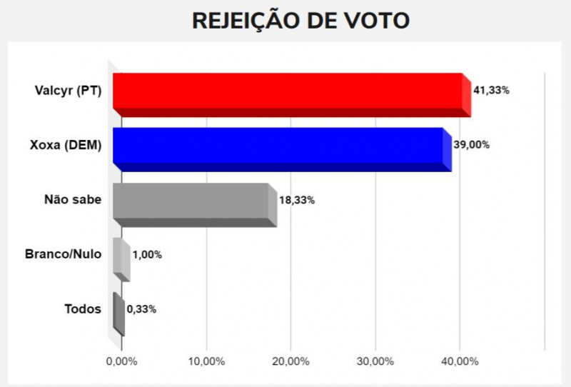 Já no cenário de rejeição, a maioria dos eleitores de Pintadas apontou Valcyr como candidato que não votaria para prefeito, ele contabilizou 41,33%. Já Xoxa teve 39%. Não souberam 18,33%, votariam branco ou nulo 1% e aqueles que optaram por “todos” são 0,33%.