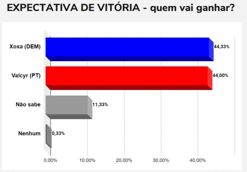 O eleitorado de Pintadas também respondeu ao questionamento sobre a expectativa de vitória na eleição municipal de 2020. Xoxa teve 44,33% neste cenário, enquanto Valcyr somou 44%. Não souberam responder 11,33% e não escolheram nenhum 0,33%.
