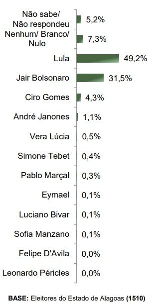 O ex-presidente Luiz Inácio Lula da Silva (PT) lidera as intenções de voto em Alagoas. Com 49,2%, o petista aparece na dianteira na corrida presidencial. O atual presidente Jair Bolsonaro (PL) soma 31,5%, segundo levantamento realizado pelo Instituto Paraná Pesquisas, entre os dias 1º e 5 de julho de 2022.
