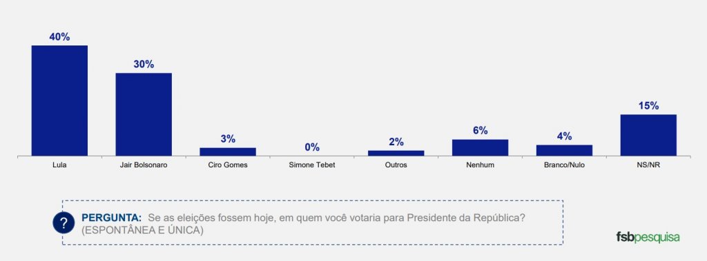 Uma nova rodada de pesquisa, encomendada pelo BGT Pactual e realizada pelo Instituto FSB Pesquisa, e divulgada nesta segunda-feira (25), coloca o ex-presidente Luiz Inácio Lula da Silva (PT) na dianteira na corrida pelo Palácio do Planalto. No cenário espontâneo para presidente, Lula soma 40% e é seguido pelo atual presidente, Jair Bolsonaro (PL), que tem 30%. Ciro Gomes é o terceiro na preferência do eleitorado, e aparece com 3%. Simone Tebet não pontuou e “outros” candidatos somaram, junto, 2%. Não sabe ou não respondeu representa 15% e brancos e nulos 4%. Outros 6% responderam que não votariam.