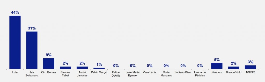 A pesquisa traz outro cenário, na intenção de voto estimulada. Lula também lidera com 44%. Jair Bolsonaro tem 31%; Ciro Gomes 9%; Simone Tebet 2%; André Janones 2% e Pablo Marçal 1%. Felipe D’ávila, Eymael, Vera Lúcia, Sofia Manzano, Luciano Bivar e Leonardo Péricles não pontuaram. Nenhum representa 5%, brancos e nulos 2% e não respondeu ou não sabia 3%.