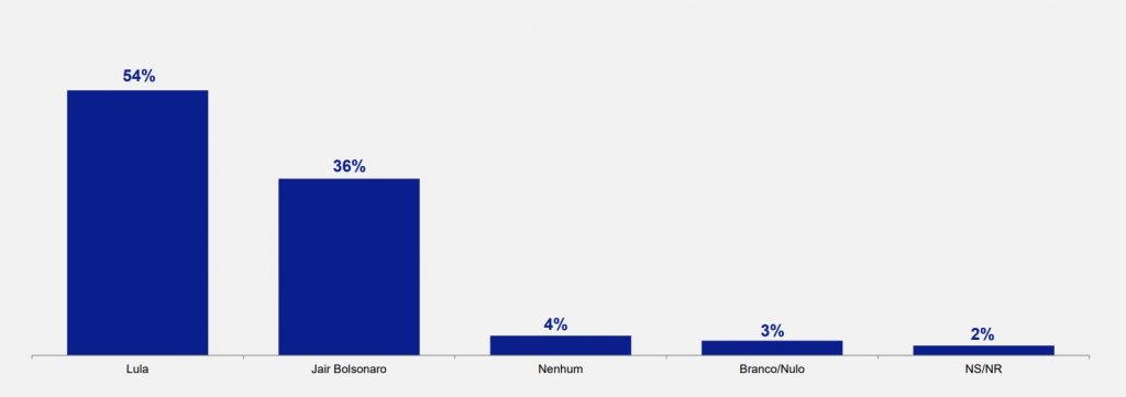 O levantamento aponta, ainda, um eventual segundo turno entre Jair Bolsonaro e Lula. O ex-presidente leva vantagem e tem a preferência de 54% do eleitorado, contra 36% de Bolsonaro. Nenhum soma 4%, branco/nulo 3% e não sabe ou não respondeu 2%.