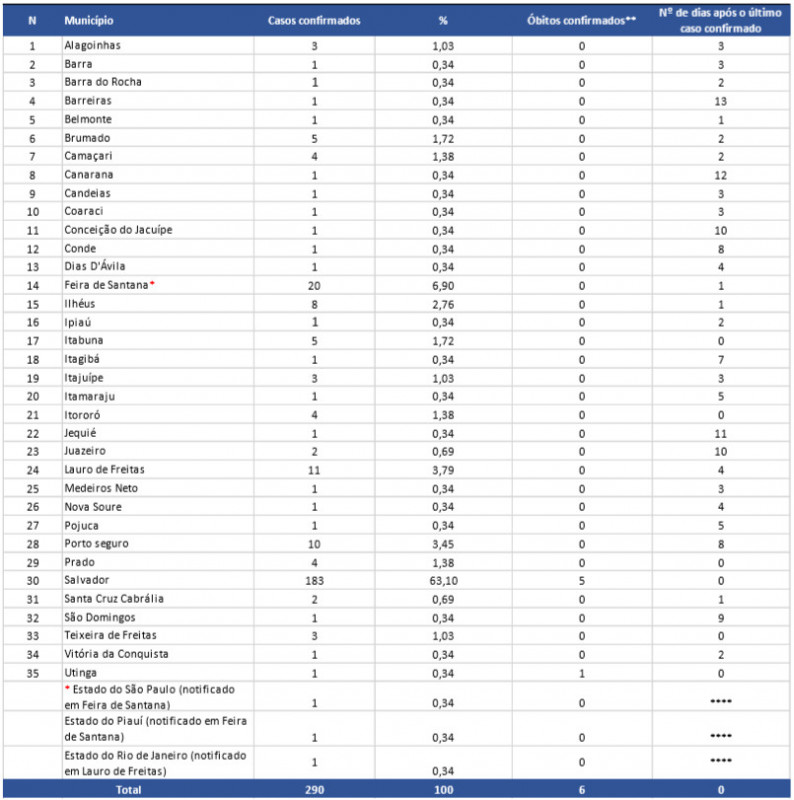 A Bahia registrou mais uma morte nesta sexta-feira pelo novo coronavírus. Trata-se de um homem de 80 anos, morador de Utinga, na Chapada Diamantina, que tinha doença cardíaca preexistente.  De acordo com a Secretaria de Saúde do estado (Sesab), até o fim da tarde desta sexta-feira (3), foram 290 casos confirmados em decorrência da Covid-19.